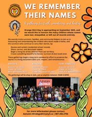 A gathering for truth, remembering, and healing. Orange Shirt Day is coming up on September 30th, and this event is to honour the many children whose names were lost, misspelled, or left out of records entirely. Being held at Clarion Lakeside Inn.