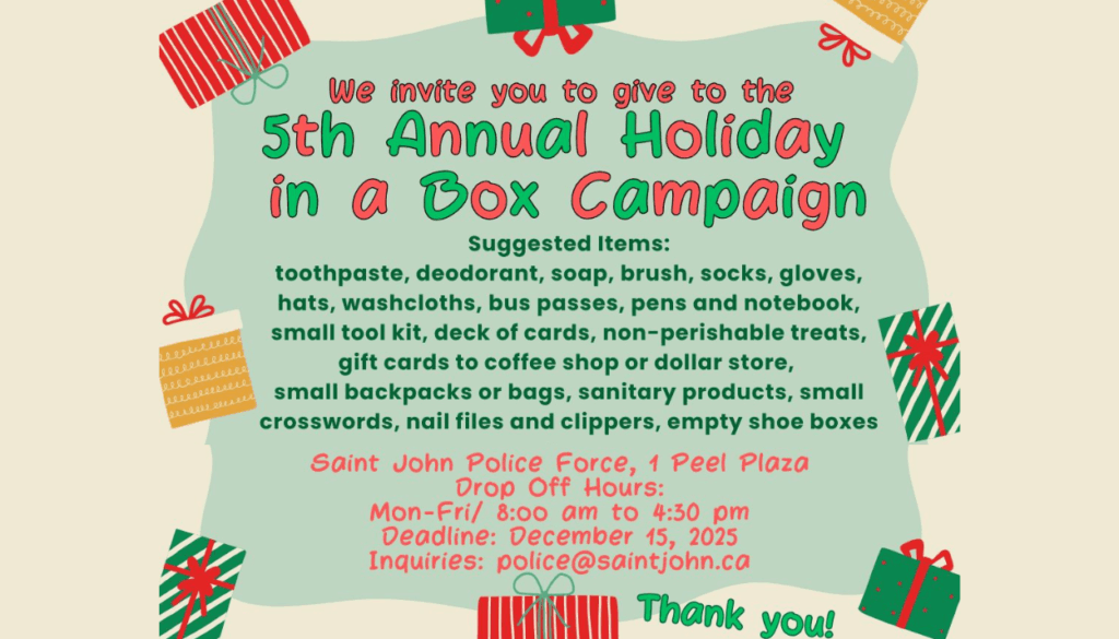 Holiday in a Box is an annual campaign started in 2021 spearheaded by the Saint John Police in partnership with the Five Priority Neighbourhoods in Saint John.
