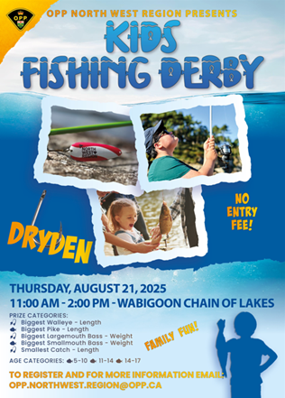 Hosted by the Dryden OPP, this free event for ages 5–17 includes prizes in various categories, BBQ lunch, Safety education, Life jackets MANDATORY; bring your own gear and have fun!