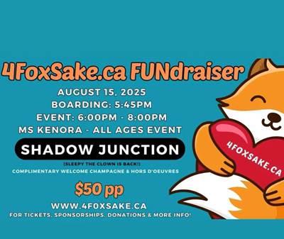 3rd Annual 4FoxSake Fundraiser in support of SickKids Hospital, featuring music from Shadow Junction live, fun with Sleepy the Clown + kids’ lower deck activities, welcome champagne & canapés, and a Stunning Lake of the Woods sunset.