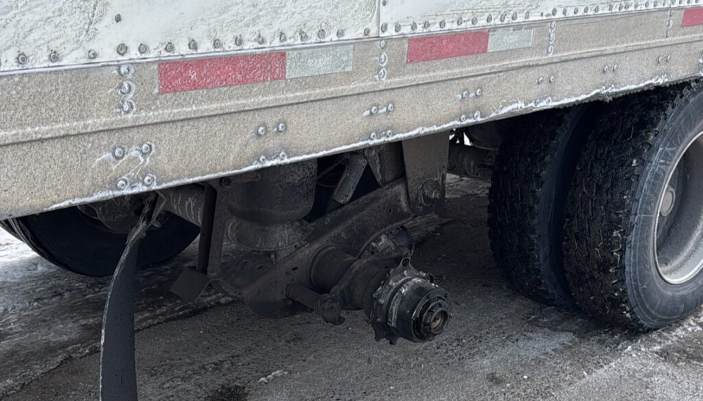 A 59-year old driver from Winnipeg (and the Winnipeg-based company that owns the vehicle) and a 24-year old driver from Brampton are charged with wheel separation. The Brampton driver is also charged with operation of an unsafe commercial motor vehicle.